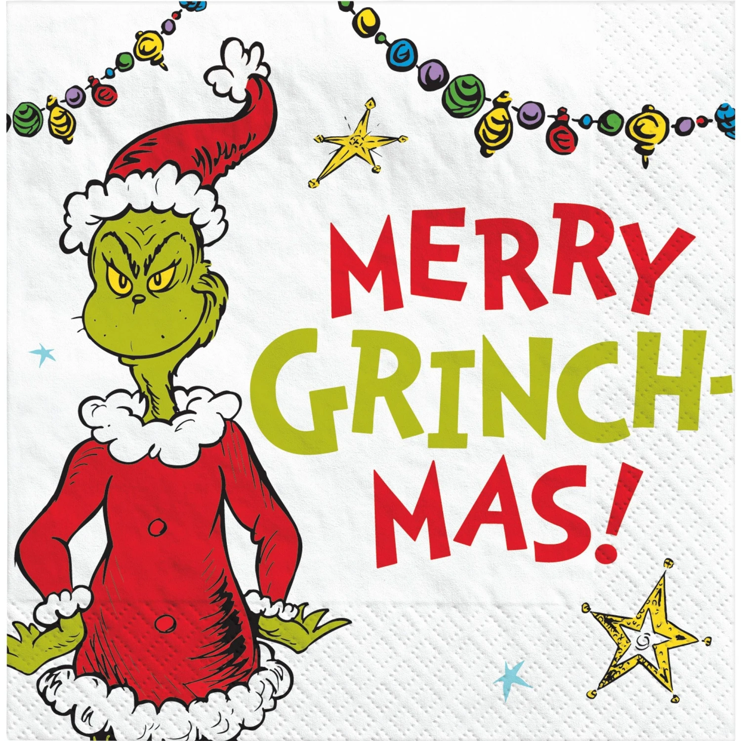 These paper napkins feature the Grinch in his festive Santa suit costume, includes 16 napkins per package.