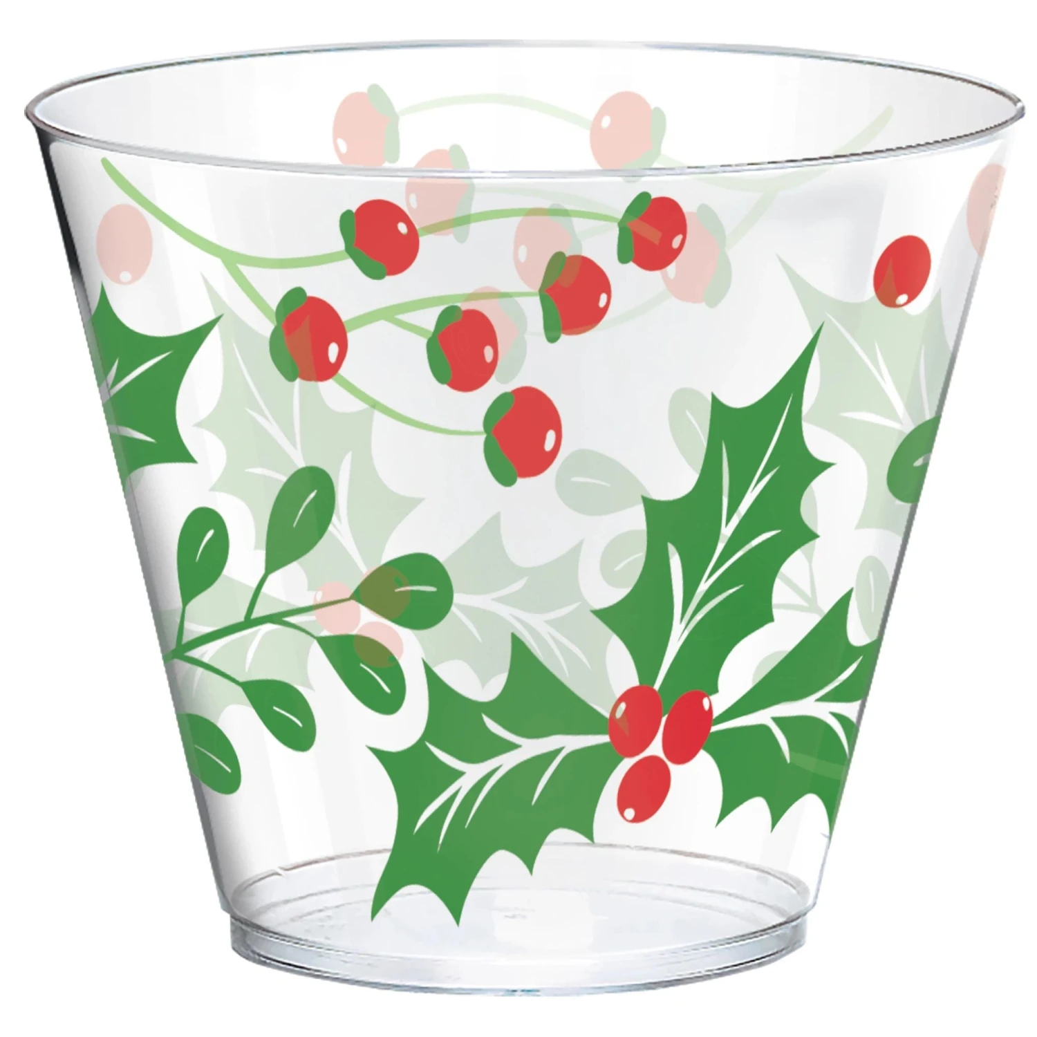 Constructed of clear plastic, this 40-count set of 9oz tumblers features a festive holiday design of holly and berries.