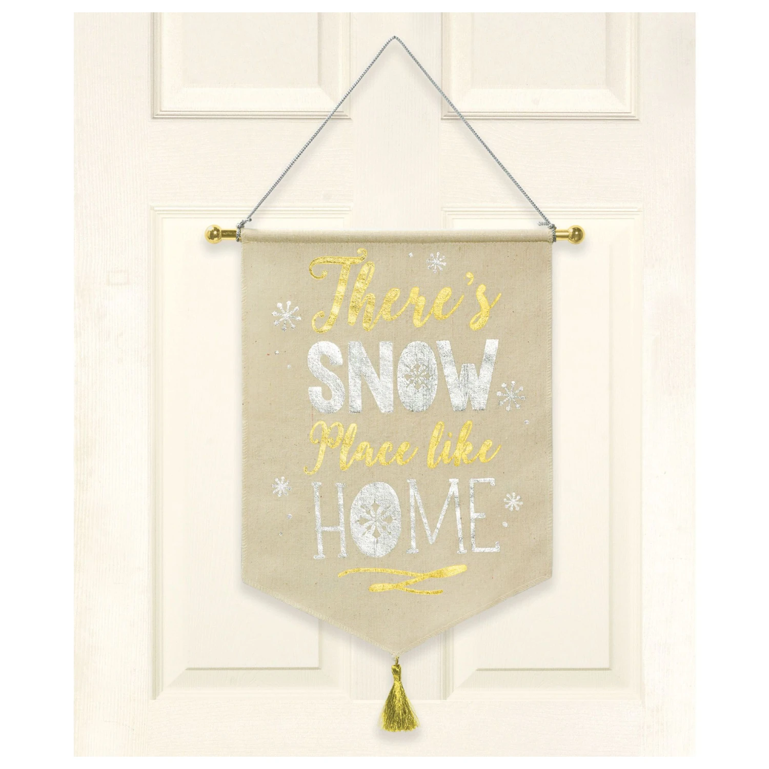 Get into the Christmas spirit by decorating your home with a Snow Place Like Home Fabric Sign! The fabric sign features a metallic gold and silver “There’s Snow Place Like Home” headline and metallic silver snowflakes. Hang this 13″ wide x 17.5″ tall sign on your front door to welcome guests to your home during the season! The attached loop has a 6in drop length.