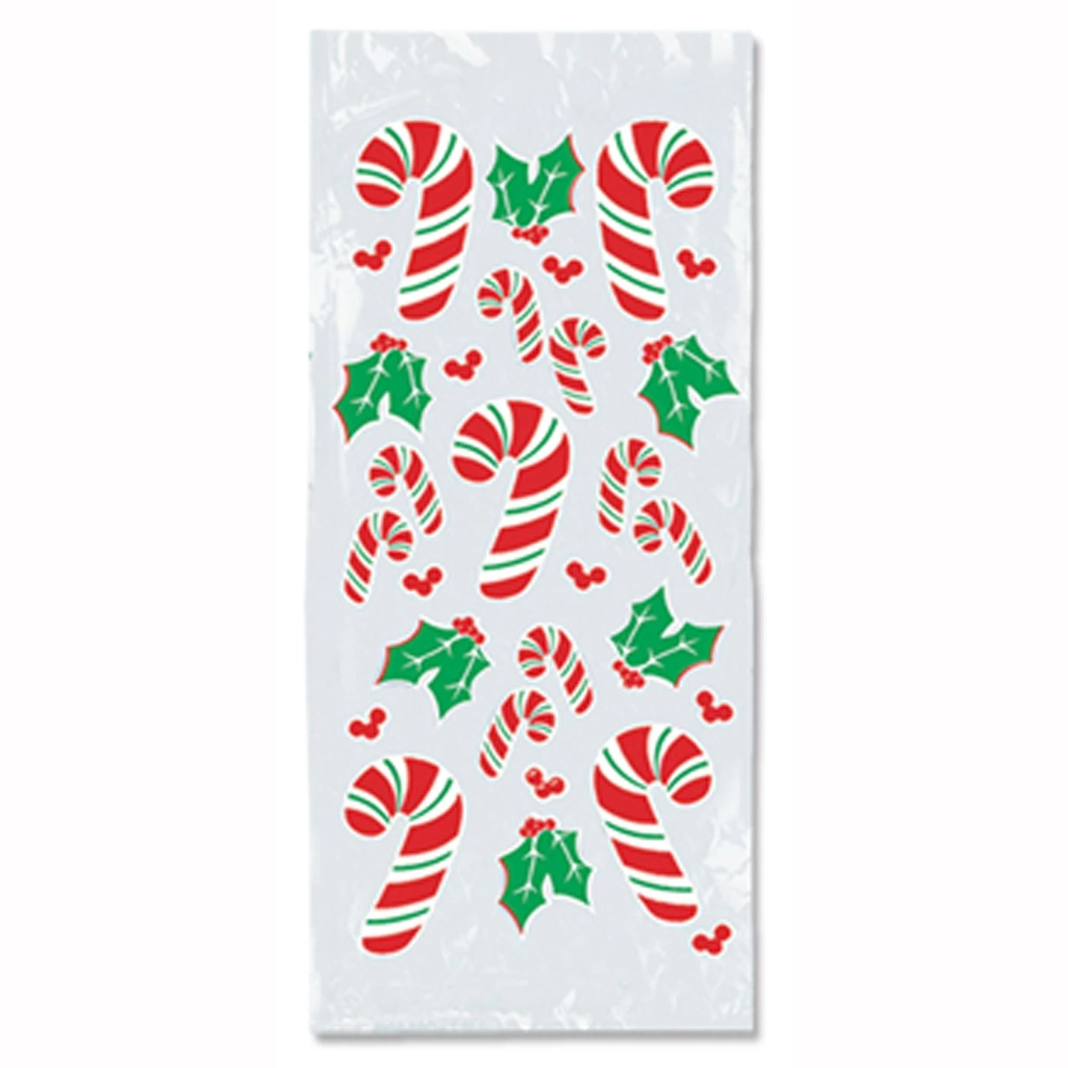 Candy Cane & Holly Cello Bags contains 25 individual units, each complete with tie closures, making them ideal for distributing festive presents and baked goods.