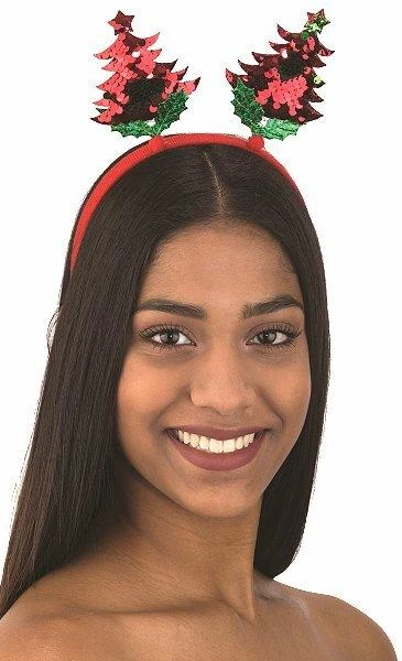 Show your Christmas spirit while wearing the sequin mini Christmas tree headband. Two sequin trees and holly leaves adorn the fabric covered headband.